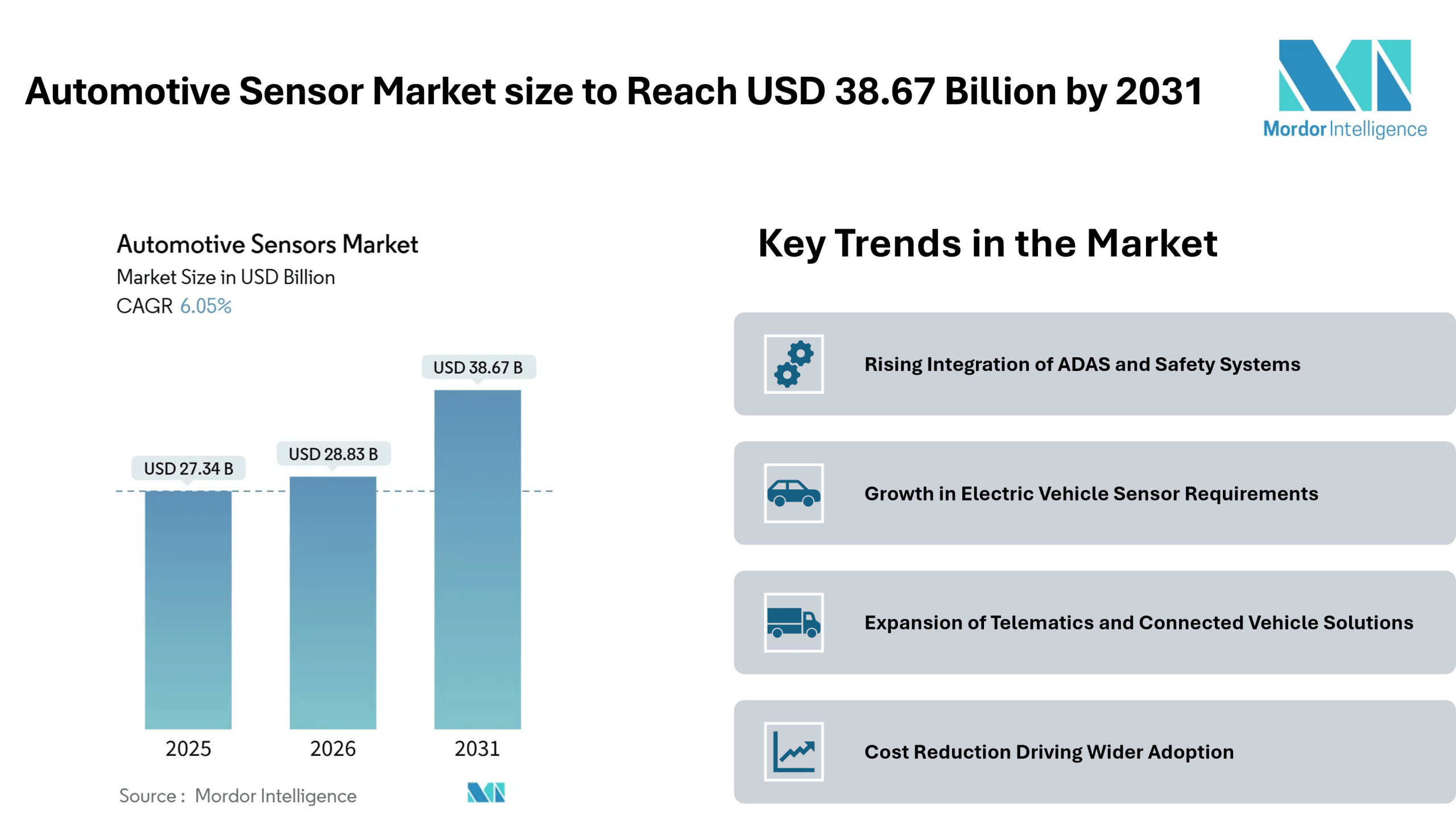According to Mordor Intelligence, the automotive sensor market size was valued at USD 27.34 billion in 2025 and is estimated to grow to USD 28.83 billion in 2026, reaching USD 38.67 billion by 2031, registering a CAGR of 6.05% during the forecast period. This steady automotive sensor market growth reflects the increasing integration of sensors across modern vehicles, where safety, efficiency, and connectivity are becoming standard expectations rather than premium features.