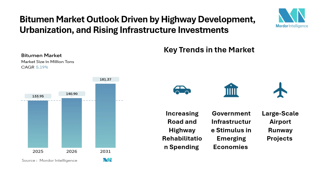 The global Bitumen Market has been experiencing steady growth as governments and private sectors intensify investments in infrastructure. The bitumen industry is expected to grow from 140.9 million tons in 2026 to reach 181.37 million tons by 2031, reflecting a compound annual growth rate of over 5% during the forecast period. Key factors driving this growth include increasing public-sector spending on roads, highways, and airport runways, as well as the rising adoption of polymer-modified bitumen for climate-resilient pavements.