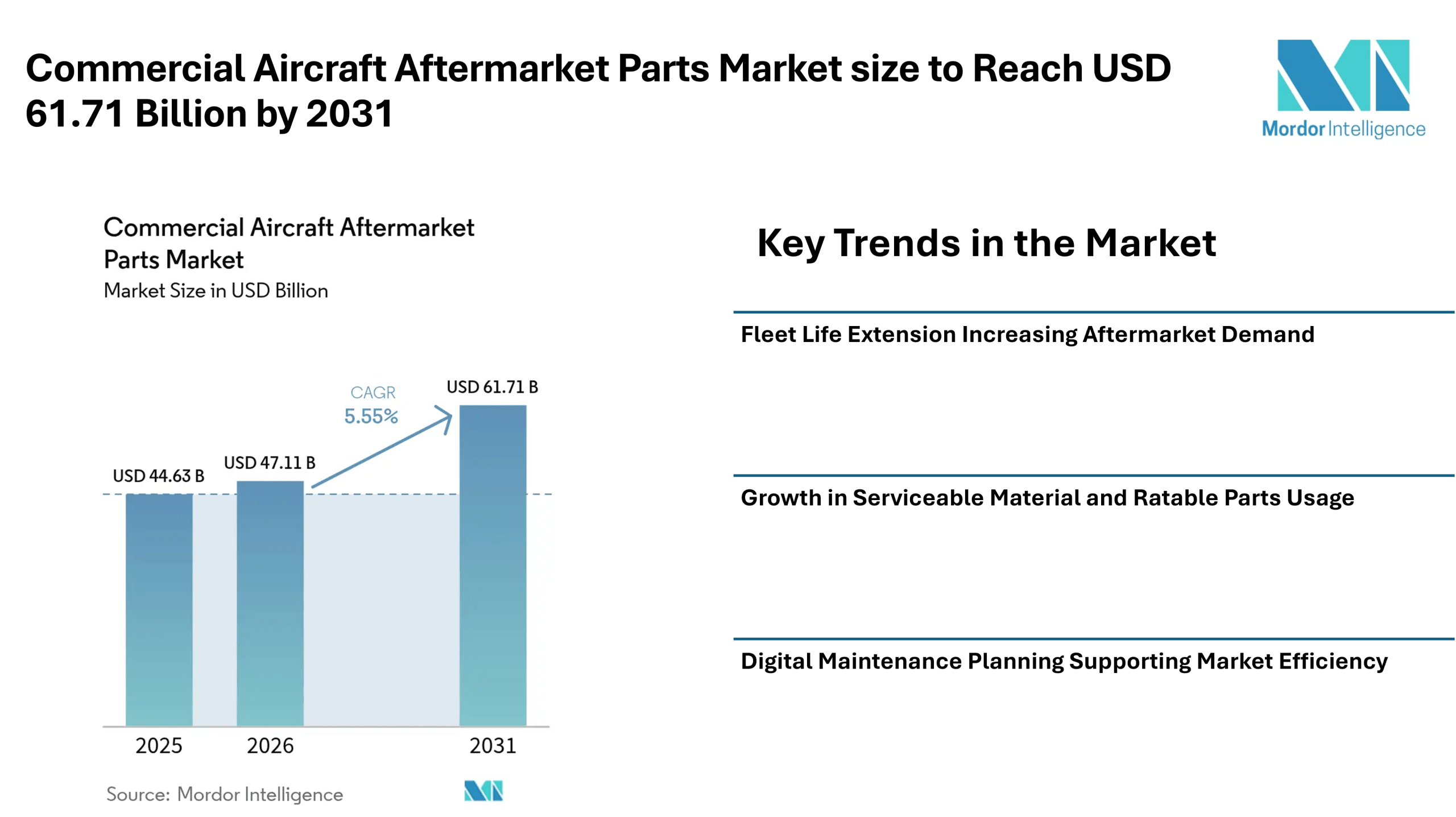 According to Mordor Intelligence, the commercial aircraft aftermarket parts market size is expected to increase from USD 44.63 billion in 2025 to USD 47.11 billion in 2026, with the commercial aircraft aftermarket parts market forecast indicating it will reach USD 61.71 billion by 2031. This steady rise reflects a consistent need for replacement parts, maintenance services, and lifecycle support across global airline fleets.