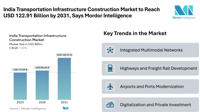 India Transportation Infrastructure Construction Market to Reach USD 122.91 Billion by 2031, Says Mordor Intelligence